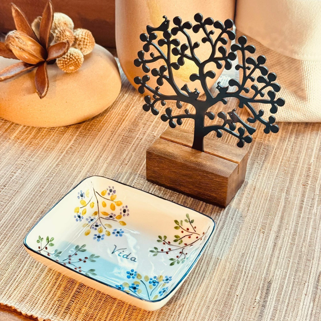 Ao seu lado, a delicada travessinha de porcelana pintada à mão, com o dizer “Vida” cercado por ramos floridos, completa o conjunto como símbolo de plenitude, crescimento e continuidade.